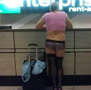 Sometimes I fly out of Palm Springs. Nice little airport, but the visuals are the best. Fashion is straight out of More Magazine (I saw the article. Seriously, a chartreuse pair of jeans?) And then there are the gals with the must-have 6-inch travel heel. Although we have the same packing strategy: per More, wear your big shoes to save packing space. And my sneakers are really big. Size 10 on one foot, 10 1/2 on the other. So that saves like half a suitcase. The other half is filled with white cotton tees, the go-to garment for a hot lady like me. As in flashes.