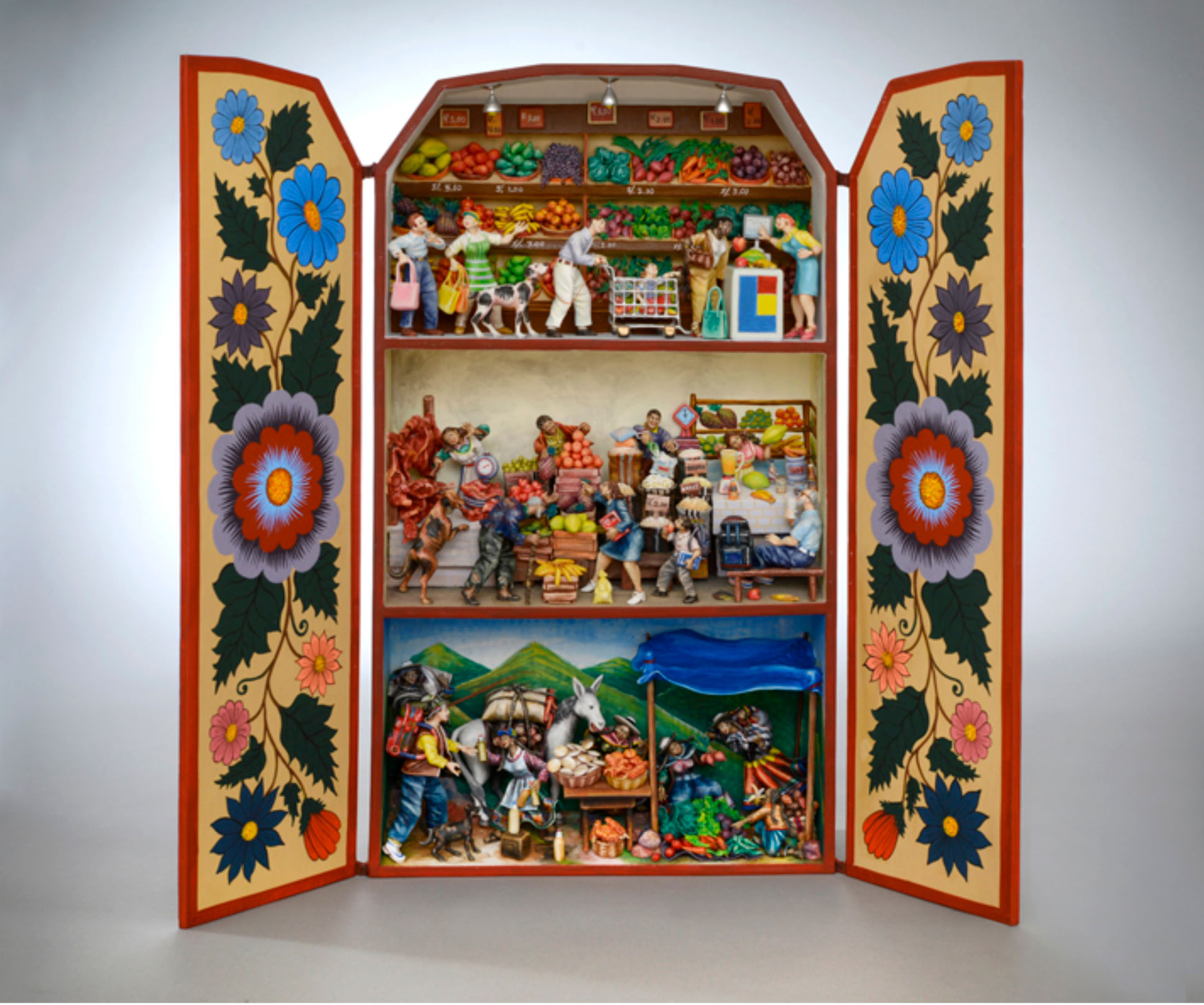 Guitierrez is 38-years-old and has always lived in the place he was born, a remote village in the Central Highlands of Peru. His journey as an artist began at the age of eleven when he saw a Retablo for the first time. Retablos are a key part of the Peruvian culture and originally served as religious shrines, but have evolved to include depictions of secular scenes of daily life and traditional events. Victor has since dedicated himself to this ancient art form that originated in the nearby town of Ayacucho.