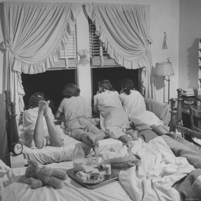 ed-clark-teenage-girls-at-a-slumber-party-talking-to-boys-who-are-standing-outside