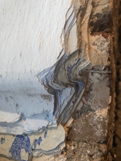 In the last property, a workman was chiseling away at the walls, releasing all of the built up layers of paint and plaster that had accumulated over 500 years. Pieces were everywhere. I looked down at the piles all around me. I stooped down and picked up a piece. I could see the countless layers of paint exposed. It was beautiful and evocative.